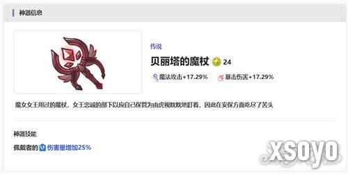 第8个神器为大家推荐贝丽塔的魔杖,这个魔杖神器具备一定的攻击力提升效果,不过这个攻击力提升只能触发在魔法类的攻击上面,如果是爆发伤害的话,那么此时带来的加成数值也是可以根据魔法伤害量来计算,带来的是角色一定百分比的数值。