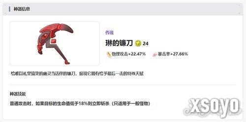 第9个神器为大家推荐的是琳的镰刀,这个神器是给物理系角色使用会比较好,因为带来的物理攻击力提升效果比较强,而在暴击率加成上面,也是比较适合物理流派使用的,而在使用这个神器拥有的普攻攻击,也是会带有一定额外的效果,这一点体现在斩杀的能力上面,如果敌方有18%的血量的话,那么此时使用斩杀这个概率触发会比较大。