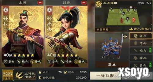两人一起上阵能激活江东帝胄,进一步提供普攻所打出的伤害,而且孙权能为队伍带来不错的暴击加成,对于走普攻流的孙尚香来说可谓非常的关键,再加上孙尚香也能为孙权提供穿透率加成,所以两名武将在相性方面可谓相当的合适,也是游戏内各大榜单上比较常见的吴国兄妹阵容。此外,若是各位担心这套阵容被反击队克制,可选车悬阵来进行应对。