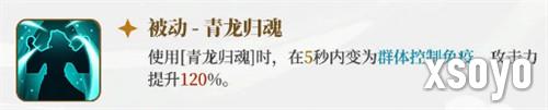 使用[青龙归魂]时,在5秒内变为群体控制免疫,攻击力提升120%。