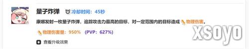 康娜的二技能量子炸弹具备自动追击特性,依然锁定敌方最强输出角色,释放后可对范围内敌人造成950%的物理伤害,在PVE环境中具备极强的爆发力。进入PVP模式后,该技能伤害下调至627%,但其追击机制保证了极高的命中率,即便对手位移或闪避,技能仍能精准命中,确保输出稳定落地,是康娜核心输出手段之一。