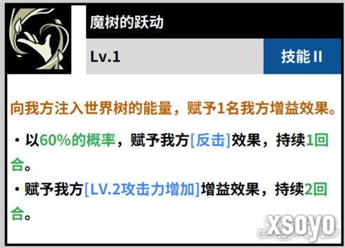 那么这里加一定量的行动力之后,我方各种增益都放在一起的话,整体提升能力还是非常大的,他的大招就是魔树降临,魔树降临这个技能使用的时候会对敌方的全体成员都带来一定的伤害,此时会给我方带来的增益效果是一个强韧的增益,持续两个回合的强韧会让此时我方一个角色带来反击的增益,这个反击的增益是只有一个回合可以用到的,而且施加的这个增益是会针对我方攻击力最高的一个角色,他进行反击的话,带来的数值是最大的,此时强韧如果生效的话,那么承受伤害量的上面会减少34%的数值。