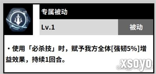 还有额外会给到行动力增加10%的增益效果,除此之外这里还有一个专属的被动,是大家使用大招的时候会触发的,只要是为了使用大招,就可以给我方全体的敌人,全体的队友都带来强韧,增加5%的增益能力,这个能力虽然只有一个回合,但是强韧的属性还是非常好用的,后期大家就可以依靠他的这些技能来做好整体队伍的支援效果啦,所以如果大家想要想找一个适合放在队伍当中使用的支援角色,本期的威廉凡金斯是非常合适的。
