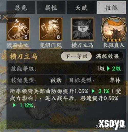 克绍门风、横刀立马是被动技能的核心组成部分,主要的目标敌人被我方击败后能够迅速对骑兵的速度进行提升,是我方能够处于一个极速追击敌方的状态,大大提升了消灭敌军的效率,在不同的战场上这一技能的实用性都很高,能够与多项基因能配合使用,营造一个最佳的作战效果。如果注重防御能力的话,那么就可以优先升级横刀立马这一被动技能,新手机强化,这一技能是最合适的,可以让玩家的生存能力优于其他角色,为后续的角色培养奠定一个较好的发展基础。