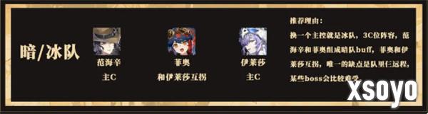 在这个队伍里面其实有两个比较核心的角色,就是范海辛和伊莱莎,其实大家在玩这款游戏的时候就会发现,在配队上面很多情况下都是只有一个核心C位的,但是在这个队伍里面有两个核心角色,这两个角色目前的话,如果用伊莱莎做主控就是冰队,换另外一个范海辛主控的话,就会变成暗队,所以这里的话,大家使用冰队上面的效果,就可以看到其中搭配起来是3C位的一个阵容,范海辛本身是暗队的一个角色,所以大家如果要组成暗队buff的话,这里可以选择另外的自由位上面放菲奥这个角色,如果大家走冰队的话,其实这里菲奥跟伊莱莎的组合也是比较固定的。