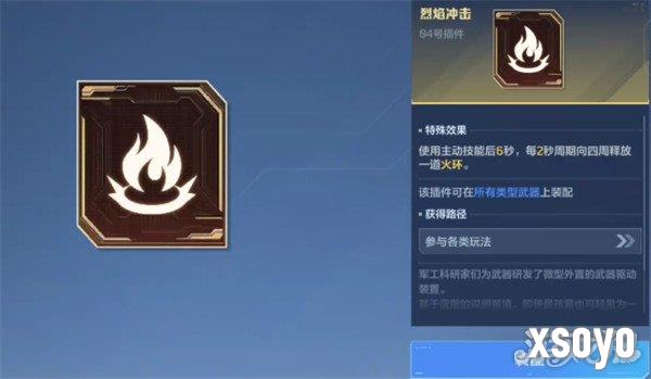 除了单纯使用武器之外,游戏里还可以通过增加插件的方式,提升整体的性能,首先玩家可以选择烈焰冲击这个插件,使用插件之后,角色会向前射出火环,并且这个插件可以应用到所有的武器上。