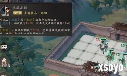 赵云的技能为虎威龙胆,它是一个切换技,可由玩家主动在虎威与龙胆之间进行切换。当该技能切换到虎威效果时,可提升赵云的物攻且受击能额外获得5点战意,若技能的效果为龙胆,则会提高赵云双防,且能消耗50点战意来抵挡一次对方施加的普攻或技能。可以说,虎威更偏向攻击,而龙胆则偏向生存。此外,该技能在切换时会,若赵云本回合使用了技能,则技能的效果为切换后的效果,具有实时生效的特性,因此在使用时无需提前去规划,想用哪一效果直接进行切换即可,也没有切换冷却。