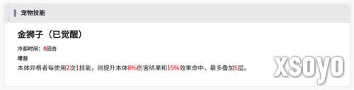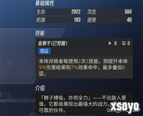 因为游戏当中即使是达到了四星的稀有度也不一定代表好用,但是这里的金狮子算是一个基础能力就比较高的攻击型智壳,它在整体能力上面是拥有一定的增益机制,使用了技能之后,它可以给本体带来一定的命中提升效果,这里的话会根据它的伤害结果来进行判定,因为命中效果也是有比例提升的,伤害结果越好的情况下,它带来的命中加成就越多,补增益能力也是可以叠加多层命中的,所以这个机制在搭配上,智壳自身有比较高的暴击数值的时候,就可以带来足够多的提升,那么金狮子在额外的优势上面还有一个自带的追击技能,所以战斗的时候,金狮子也是可以积累足够的增益,带来大幅度伤害的。