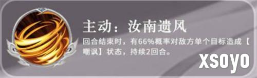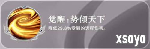 而他的主动技能叫做如南遗风,这个技能是在一个回合结束之后才可以使用的,在其中会有66%的概率,可以给敌方的一个目标带来嘲讽的状态,所以上面说到如果想要控制的话,这个嘲讽技能就是他可以在这个时候用到的一个主动技能,一般放在控制流里面,其实是可以在开场时期就用到敌人身上的,另外他还一个觉醒技能叫做势倾天下,这个技能效果特别简单,在游戏当中主要就是降低袁绍受到的远程伤害,这里降低的数值达到了29.8%。