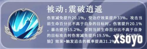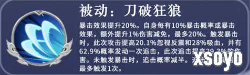 而他的被动技能叫做刀破狂狼,这个技能是给他自身的暴击带来额外提升的,此时提升了20%的暴击之后,他自身还会根据每10%的暴击概率,额外提升1%的伤害减免,当然这个百分比最多是可以叠加到20%的,再提升到20%伤害减免之后,他就无法再进行叠加了,如果这个被动触发了暴击的话,那么此时攻击提升的数值会有20%,最后的数值可以忽视反震,而且他会带来一个吸血的效果,并且有62%左右的概率发动一次追击的能力,这一次追击的话,还会提升自身29%的伤害数值,如果这个技能没有触发暴击的话,那么追击触发的概率就会减掉一半,这里的追击效果其实在每一个回合里面都是可以进行尝试触发的,但是一个回合只最多只能用一次。