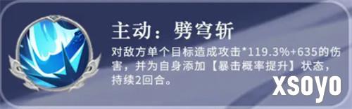 张辽的主动技能叫做劈穷斩,这个技能也是一个单体输出的技能,造成的攻击跟上面的技能差不多,但是此时还会给自身添加一个暴击提升概率的状态,这个提升的持续时间也达到了两个回合,最后的一个被动叫做震破逍遥,这个技能是属于一个伤害减免的技能在,此类前面的效果上面,他会提升20%的数值,而且如果他在被动生效期间受到治疗的话,那么这个恢复的效果会提升33%,当他攻击的话,只要敌方的生命数值目前比张良要低的话,伤害还会提升20%左右的数值,如果是暴击类的输出,则在上面会提升15%的数值,受到当前生命影响的效果,他自身的伤害界面也会提升到16%的数值,所以相对来说,他后期触发一些被动效果的话,整体的输出会有更大的提升,而受到的伤害会有减少。