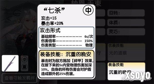柚恩的技能其实非常适配蛞蝓,但是装备栏限制了只能携带中型和重型装备,如果有队友的情况下其实也可以选别的,所以这里大家可以尝试选择七杀重剑追输出,她搭配了七杀之后攻击上面有+15的数值提升,然后在暴击率上面也有20%的加成,这样再基础的频率上面就可以达到6s/次的输出,然后伤害倍率也可以达到150%的数值,同时伤害类型就是基础的物理伤害。