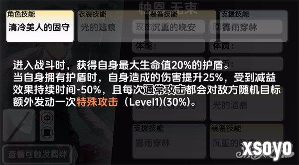 柚恩角色技能上面可用的是清冷美人的固守这个技能,效果是一到进入战斗时,柚恩就可以获得自身最大生命值20%的护盾,当她自身拥有护盾时,可以造成的伤害就会提升25%,切受到减益效果持续时间-50%,这里只要是技能生效那么每一次通常攻击都会对敌方随机目标额外发动一次特殊攻击,所以算是一个通常攻击的强化效果。