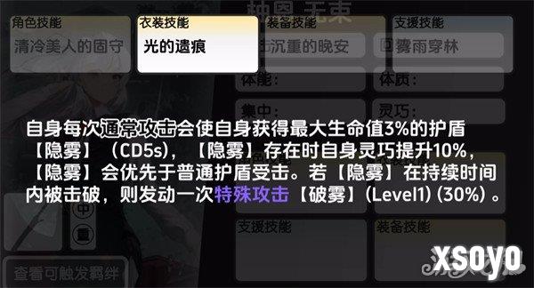 衣装技能叫做光的遗痕,只要是柚恩使用这个技能,那么每一次使用通常攻击的时候,都会使她自身获得最大生命值3%的护盾【隐雾】,这个护盾的持续时间是达到了5s的,而【隐雾】属于她的一个专属状态,生效的时候只要存在场上,那么柚恩自身的灵巧会提升10%,然后【隐雾】会优先于普通护盾受击,如果【隐雾】在持续时间内被击破,则发动一次特殊攻击叫做【破雾】,输出也有30%左右的提升效果。