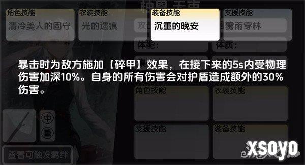 装备技能大家可以选用沉重的晚安,有了这个技能效果柚恩就可以在暴击时为敌方施加【碎甲】效果,在接下来的5秒内受物理伤害加深10%,且她自身的所有伤害会对护盾造成额外的30%伤害。柚恩最后的支援技能叫做雾雨穿林,这个支援的效果是当己方有角色护盾被击破时就可以触发技能的能力,此时柚恩会发动一次特殊攻击【破雾】带来输出,但是这个支援技能的效果是每8秒只能触发一次的,所以大家要计算好使用间隙。