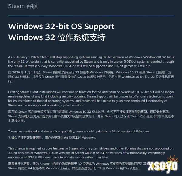 Steam官方确认将于2026年1月1日起终止对Windows 32位系统的支持,受影响设备仅占活跃用户0.01%。届时32位客户端将无法获得安全更新与技术支援,Valve强烈建议用户升级至64位系统以保障体验与安全。