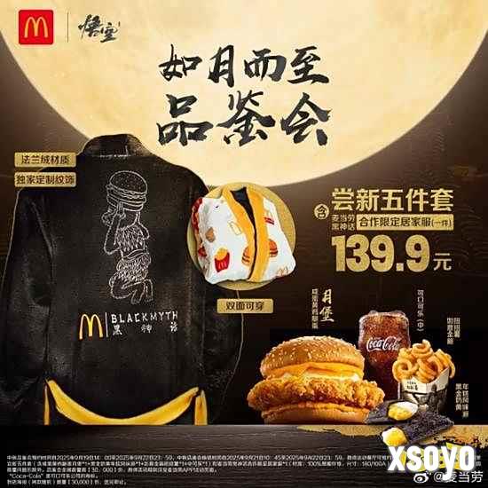 麦当劳于2025年9月19日宣布与国产游戏《黑神话:悟空》联动,推出139.9元限定套餐,含咸蛋黄鸡腿蛋月堡、黑金奶黄年糕风味派等特色美食及限量居家服周边。活动预约火爆,全国3万份品鉴会名额迅速抢空,海外玩家在社交平台表达羡慕之情,称其创意十足且充满文化特色 。