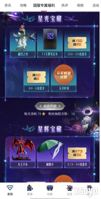 为了庆祝“天外飞星”的回归和寰宇英雄宝藏的上线,DOTA2国服还特别推出了一系列优惠活动。玩家只需参与一系列国服任务即可领取星徽,消耗星徽进行抽奖,赢取包括卓尔游侠、痛苦女王、风行者三款至宝手办在内的丰厚周边奖励,TI主题笔记本,另外还有满减优惠券让你更实惠的购买宝瓶。此外,累计付费还可解锁不同档位的暴击倍率,让玩家在更快的收集星徽。快来国服DOTA2活动界面领取优惠,一起迎接“天外飞星”的荣耀回归吧!