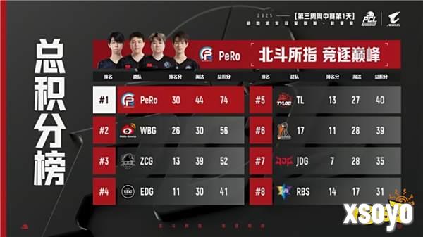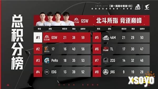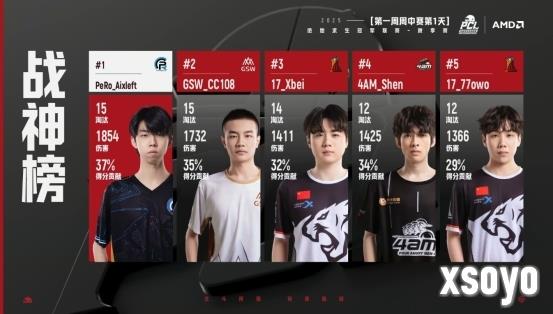 首日赛后,GSW凭借着59的总积分暂居第一,随后是17战队和PeRo战队,战神榜第一名则是给到了PeRo战队的Aixleft。