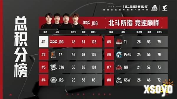 在9月14日 的第二阶段积分结算时,表现出色的JDG以123分稳稳占住榜首,随后是17占队和CTG,而来自JDG战队的SuZe则是获得了本轮的战神榜第一名。