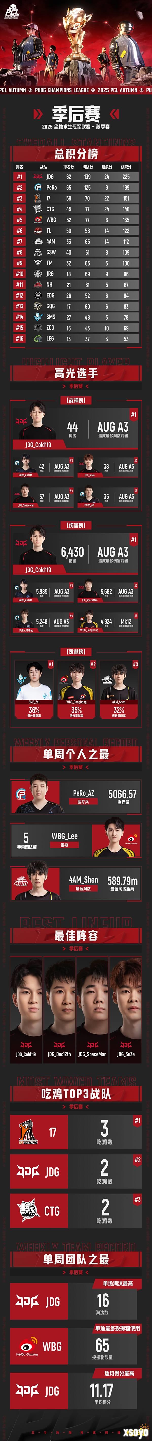 而最后凭借着多场的吃鸡,以及积少成多的得分点,JDG成功拿下了本次PCL2025秋季赛季后赛的总冠军!而PeRo则是以400的高分拿到了PGC积分的榜首。