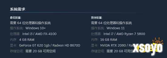 根据Steam商店页面显示,本作最低配置需要Intel i3或AMD FX-4100处理器以及GeForce GT 620 1gb或Radeon HD 8670D显卡,而推荐配置需要Intel i7或AMD Ryzen 7 5800处理器以及NVIDA RTX 2080或Radeon RX 6750显卡。