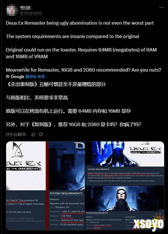 考虑到玩家们对于该复刻版图形质量的争议,这样的硬件配置显然让人感到困惑。有玩家吐槽:“原版《杀出重围》甚至可以在烤面包机上运行,仅需要64MB内存和16MB显存。而复刻版竟然推荐16GB和2080显卡,你疯了吗?”