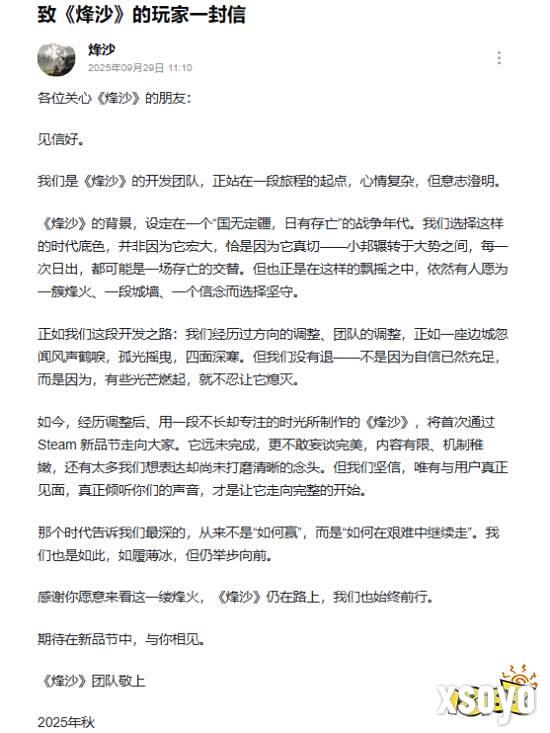 此前,游民曾报道《烽沙》的实机预告,与游戏细况,而游戏官方目前发布一篇致玩家的信,表达了游戏开发的不易,并希望各位玩家能在10月新品节关注《烽沙》。