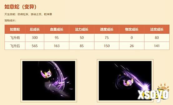 进阶成为变异宠物“如意蛇”的方法:小如意蛇不仅可以通过超级归元露强化,还可通过新服累计充值送豪礼、寻仙问道(灵气值达到500点、3000点、4000点、7000点)与300点活跃度宝箱活动中产出的如意蛇福袋进行强化。当小如意蛇已经法攻强化3次后,可前往“灵兽异人”处提交3颗变异精魄进阶为变异宠物“如意蛇。