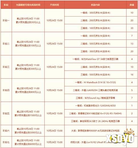 截止至10月24日11:00,在新服“如意蛇”服务器预充值即可参与预充值大派送活动。在新服进行预充值满30元及以上即可获得一个抽奖资格码。活动共有七个阶段,每个阶段都有不同的奖励,累积预充值额度越高可参与抽奖的次数也就越多,奖池内的奖励也就越丰厚。充值超过最大累计充值额度6000元,则可直接获得7个抽奖码。