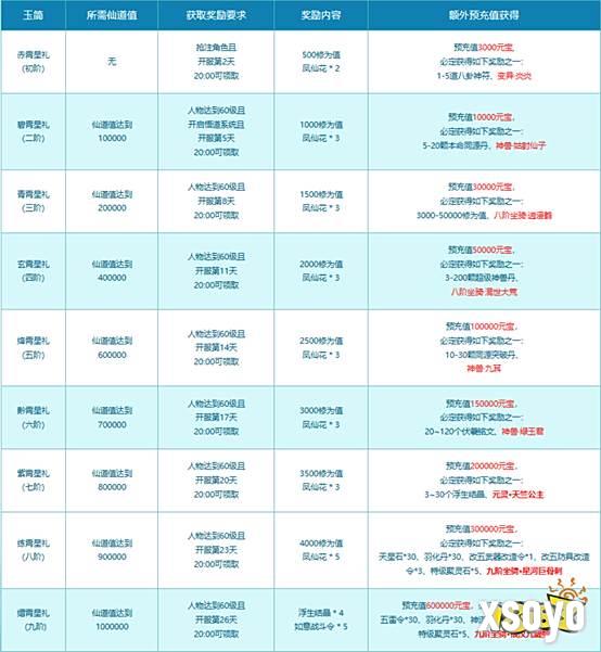 10月13日00:00至11月23日23:59期间,道友们在新服注册角色和进行预充值都可以增加新服的仙道值。累计仙道值可以激活不同档次的九霄星礼,,预充值达到对应金额还将有机会把天竺公主,九阶坐骑星河巨骨刺、银汉九曜鲲,八阶坐骑混世大荒等神兽坐骑带回家!