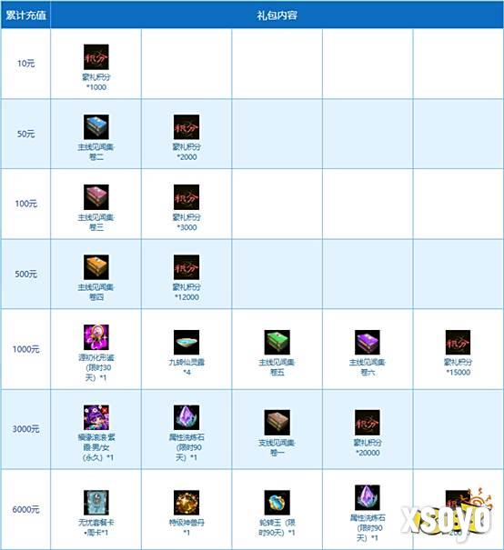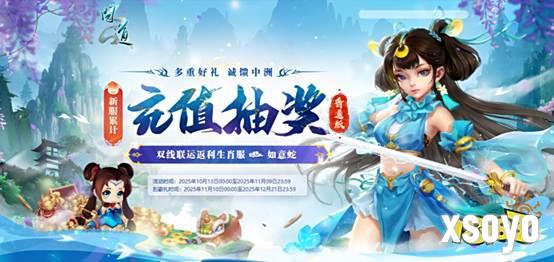 活动期间(10月13日00:00至11月09日23:59)在新服“如意蛇”累计充值达到以上金额均可获得丰厚的累计充值礼包!获得的豪礼积分可以进行抽奖或兑换福袋。福袋有机会开出随机元灵、神兽、神兽精魄、变异精魄、80级随机所有相首饰等大奖。其中玩家充值每达到50元、100元、500元、1000元、3000元、6000元阶段时,还可以额外获得一个刮豪礼资格。刮豪礼有几率获得随机元灵、限定八阶坐骑光焰北斗、随机九阶坐骑、随机神兽等超级大奖。