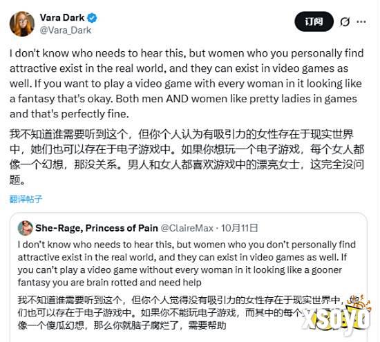 “我不知道谁需要听这个,但现实中确实也存在你个人觉得漂亮的女性,她们当然也可以出现在电子游戏中。如果有人想玩每个女性角色都长得像理想幻想一样漂亮的游戏,那完全没问题。男性和女性都喜欢游戏里的漂亮角色,这完全合理。”