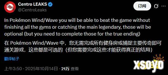 玩家可以在不完成所有道馆或捕获传说宝可梦的情况下通关。所有这些任务都是可选的,但若想达成“真结局”,则必须完成。