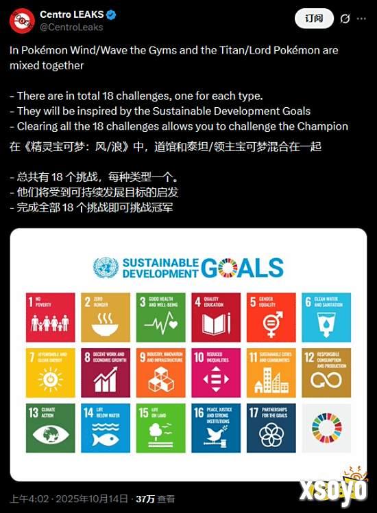 至于Boss战部分,玩家需要同时面对风浪道馆以及巨型宝可梦的混合挑战。游戏共有18场挑战,每场对应一种宝可梦属性。这些挑战的设计灵感来源于“联合国可持续发展目标(SDGs)”,完成全部挑战后,玩家即可向冠军发起挑战。