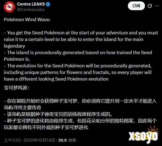 另外,本世代宝可梦据称还将引入“种子宝可梦(Seed Pokémon)”。这类宝可梦会在玩家旅程之初获得,玩家需将其培养到一定等级,才能前往栖息着传说宝可梦的岛屿。该岛屿的地形会根据“种子宝可梦”的训练程度程序生成。此外,“种子宝可梦”的进化形态也会以程序生成的方式呈现,包含独特花纹,这意味着每位玩家的种子宝可梦都将是独一无二的。