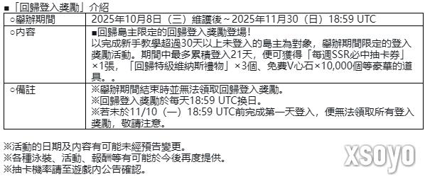 其他还举办了以许久未游玩『DOAXVV』的玩家为对象,可以获得豪华道具的「回归登入奖励」。请千万别错过纪念6.5周年的豪华活动,以及尽情享受『DOAXVV』的绝佳机会。