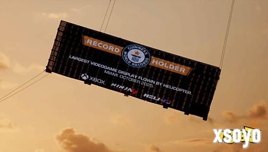 两架直升机协同作战,一架吊载面积超过200平方英尺(约26英尺宽)的巨型屏幕,另一架搭载Team Ninja社区经理与钻石认证歌手Swae Lee,在飞行中实时演示游戏操作,成功创下“由直升机吊载的最大电子游戏显示屏”吉尼斯世界纪录。