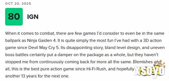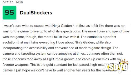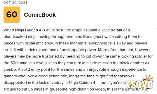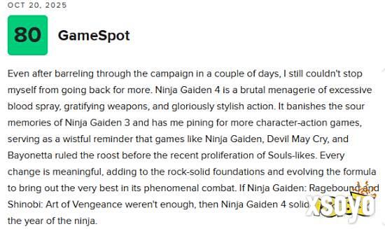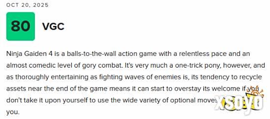 2025年10月21日,《忍者龙剑传4》正式发售,Metacritic媒体评分解禁,Xbox Series X版均分83分(36家媒体),PC版82分(22家媒体),PS5版81分(22家媒体)。DualShockers给出95分满分盛赞战斗系统进化,IGN、GameSpot等多数媒体肯定其高速战斗的爽快感与视觉表现,但普遍指出剧情深度不足、后期内容重复及Boss战设计不稳定等问题,形成“战斗极致爽快,叙事略显单薄”的评价共识 。