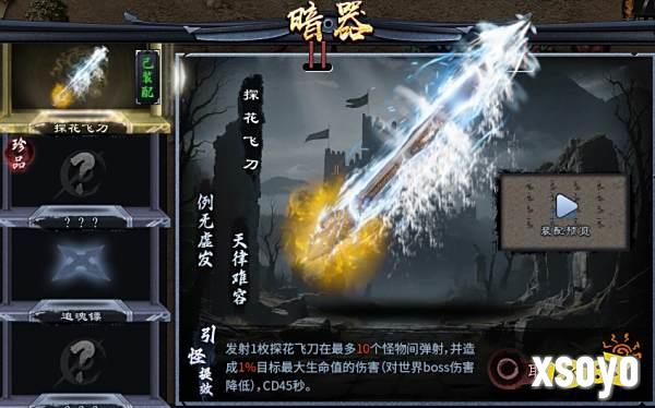 在武侠小说里,很多高手都会使用暗器,游戏中也单独加入了一个暗器系统,需要用任务和刷怪获取的特殊道具去解锁不同的暗器。不过比小说中更强悍的是,这个暗器不需要瞄准甚至不需要手动发射,冷却CD之后就会自动射出,对敌人造成大量伤害,比较适合对战中小boss,如果要打世界boss的话,暗器的伤害会相应降低。