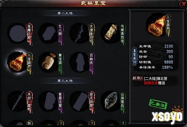 另一个“武侠特色”是“武林至宝”系统,就像那种江湖上赫赫有名,人人都想寻找的神兵利器或有奇妙能力的宝物一样,《千击武侠沉默》中也有这样神秘的存在,同样通过特殊的剧情任务、刷怪或部分充值活动来获取,它不但能给玩家带来大量属性加成,还有一些在指定大陆上能够激发的特殊效果。