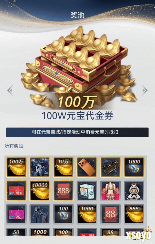 这次奖池里还有各种大额元宝代金券,最高可达100W元宝!这些元宝代金券,都可以在元宝商城、指定活动中消费元宝时抵扣,成为大家在天下“买买买”的最大底气!