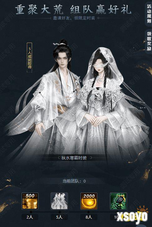 随着组队人数增加,专属奖励也将陆续解锁,包括500绑定金、封·炼化之灵(2000)!只要小队达到5人,那么全队成员均可获得永久时装【秋水寒霜】,达到10人,还能将经典坐骑【一叶扁舟】带回家!