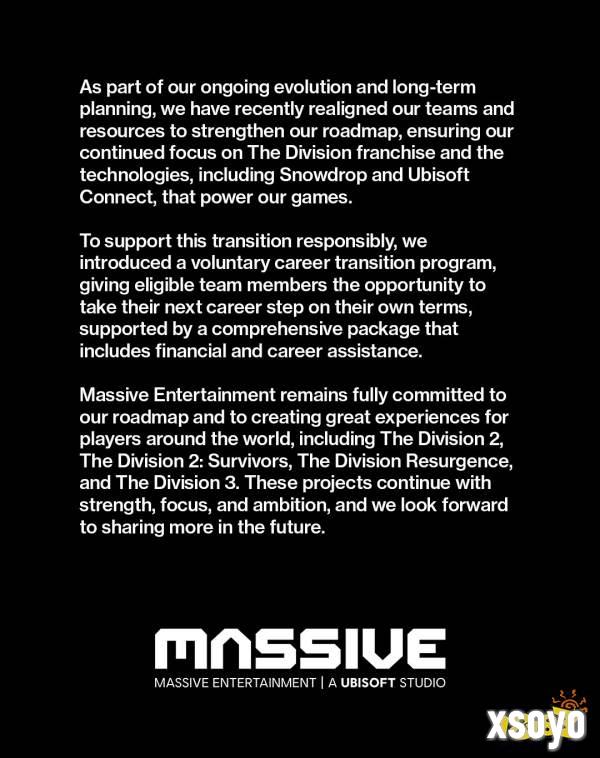 声明中写道:“作为我们持续发展与长期规划的一部分,我们最近对团队和资源进行了重新调整,以强化未来路线图,确保继续专注于《全境封锁》系列以及支撑我们游戏的相关技术,包括Snowdrop引擎和Ubisoft Connect。”