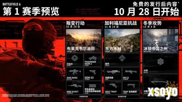 《战地6》第一赛季分成三个阶段陆续推出,分别是叛变行动(10.28),加利福尼亚抗战(11.18)和冬季攻势(12.9),带来全新武器、装备、小工具、地图,以及为门户模式准备的每月更新内容。