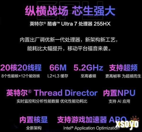 ROG魔霸新锐2025还采用了酷睿Ultra 7 255HX处理器,20核20线程,睿频可达5.2GHz,另有30MB三级缓存+游戏加速器APO,游戏表现更进一步。此外全新的酷睿Ultra系列处理器还具备卓越的能效表现,高性能时功耗更低,发热更少。