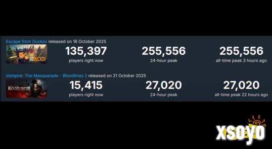 而10月22日发售的《吸血鬼:避世血族2》似乎就没那么好运。推主Pirat_Nation整理出两款游戏的Steam数据对比图,《逃离鸭科夫》几乎是《避世血族2》的9倍!