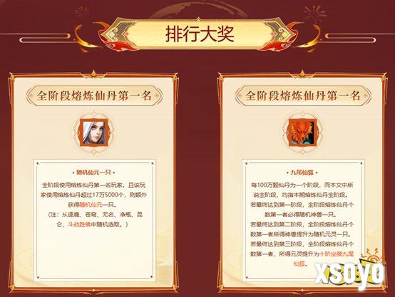 若全服熔炼仙丹总量达到第三阶段(300万颗),全阶段熔炼数量第一的玩家将直接获得十阶坐骑九尾仙狐。全阶段使用熔炼仙丹第一名玩家,且该玩家熔炼超17.5万颗仙丹,还可额外解锁随机仙元(从逐鹿、苍穹、无名、净瓶、昆仑、斗战胜佛中随机选取。)